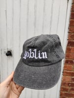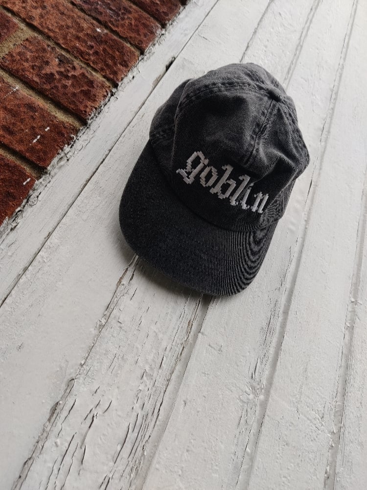 adjustable 100% brushed washed cotton relaxed 5-panel vintage cap with retro video game inspired goblin embroidery and metal clasp